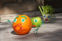 An orange, eggplant, fennel and apple are fighting with each other, until...